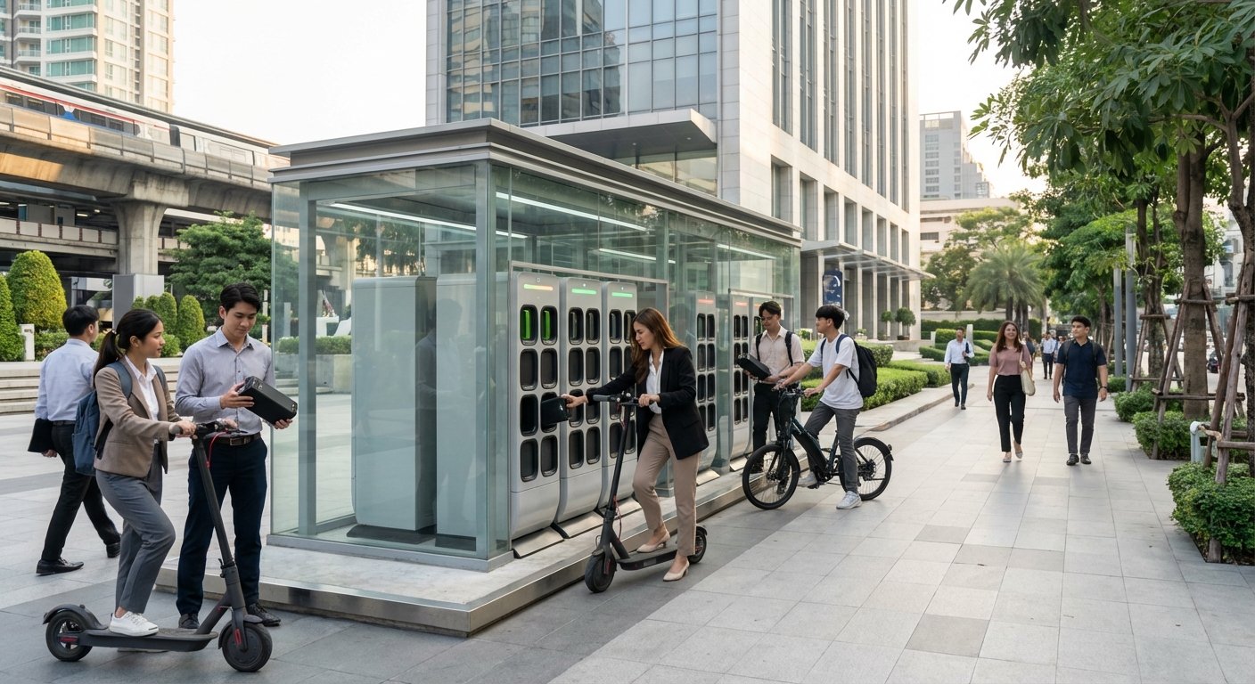 สถานีสลับแบตเตอรี่ (Battery Swapping Station) คือจุดเปลี่ยนสำคัญของวงการยานยนต์ไฟฟ้าขนาดเล็กในประเทศไทย แนวคิดนี้ถูกพัฒนาขึ้นเพื่อแก้ไขปัญหาหลัก (Pain Point) ของการใช้ E-Bike และ Electric Scooter นั่นคือระยะเวลาในการชาร์จพลังงาน (Energy) ที่ยาวนานและข้อจำกัดเรื่องระยะทางวิ่งต่อการชาร์จหนึ่งครั้ง ด้วยนวัตกรรมนี้ ผู้ใช้งานไม่จำเป็นต้องเสียเวลารออีกต่อไป แต่สามารถขับขี่เข้าไปยังสถานีบริการ นำแบตเตอรี่ (Battery) ที่พลังงานใกล้หมดออก แล้วสลับกับแบตเตอรี่ที่ชาร์จเต็มแล้วได้ในเวลาเพียงไม่กี่นาที