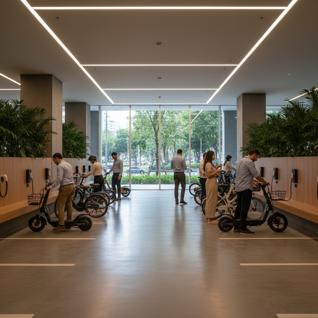 - โซนจอดพร้อมชาร์จ (Charging Zone) สำหรับ E-Bike และ Electric Scooter กำลังจะกลายเป็นสิ่งอำนวยความสะดวกพื้นฐานที่สำคัญในโครงการคอนโดมิเนียม เพื่อดึงดูดกลุ่มคนรุ่นใหม่ นักศึกษา และวัยทำงาน