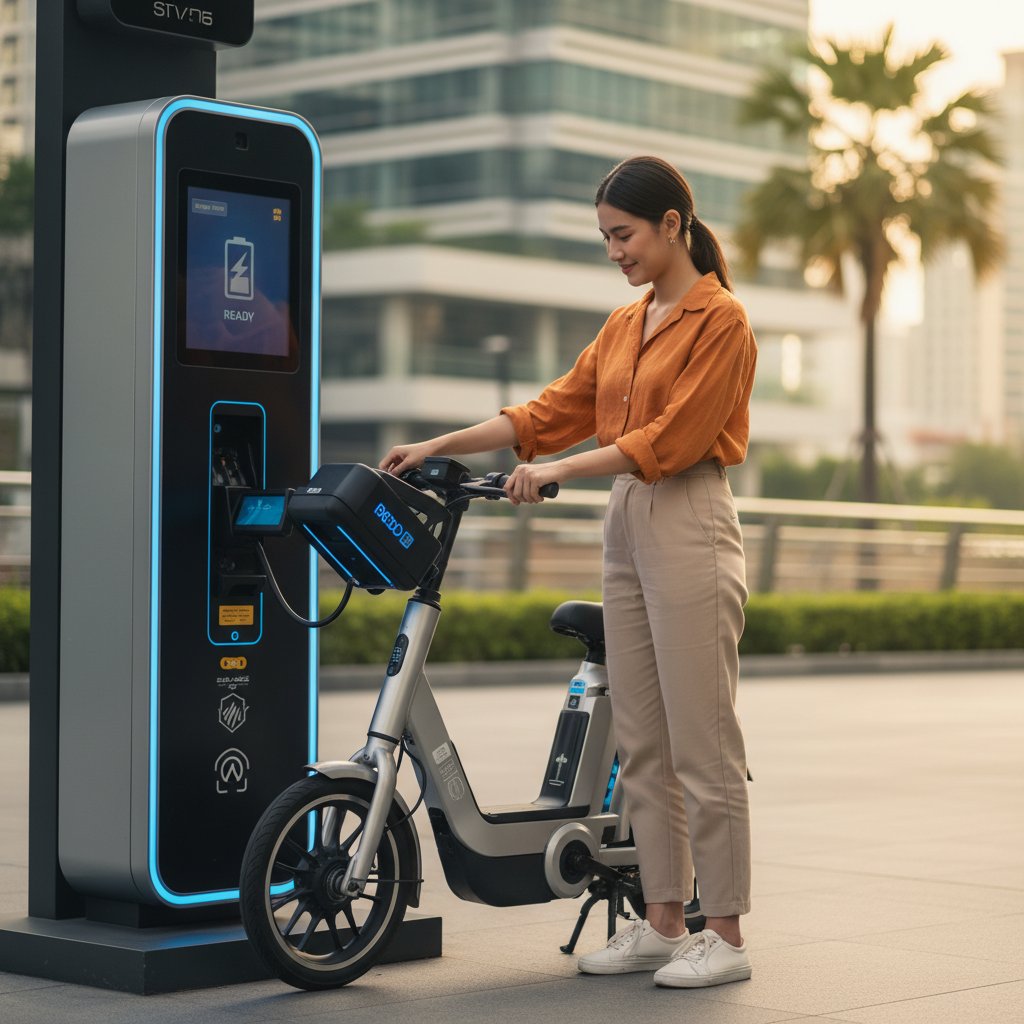 - เข้าสู่สถานี: ผู้ขับขี่นำ E-Bike หรือมอเตอร์ไซค์ไฟฟ้าที่แบตเตอรี่ใกล้หมดมายังสถานีบริการที่ใกล้ที่สุด