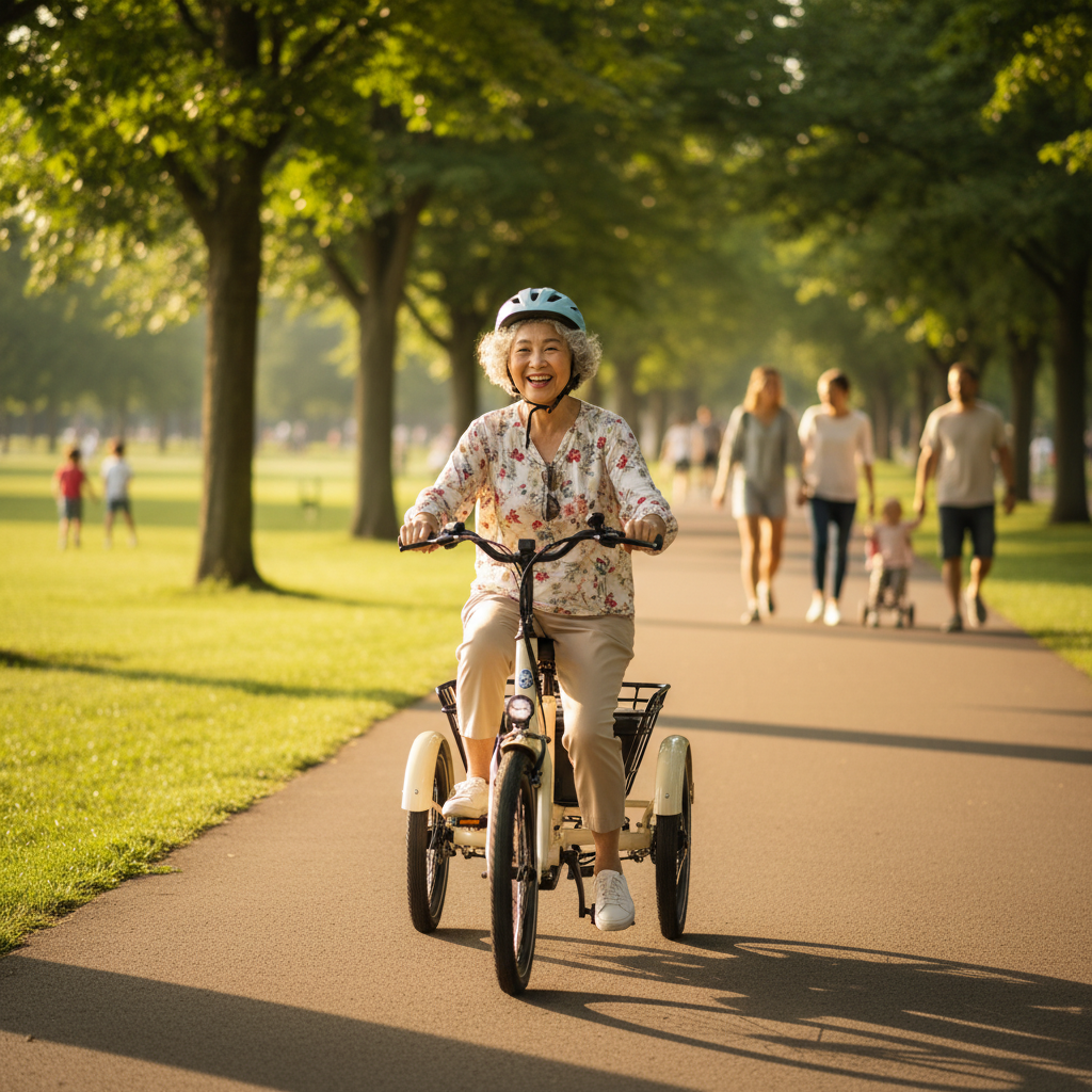 - จักรยานไฟฟ้าสามล้อ (E-bike สามล้อ ผู้ใหญ่): เป็นตัวเลือกที่ปลอดภัยที่สุดสำหรับผู้สูงวัย เนื่องจากให้การทรงตัวที่มั่นคง ลดความเสี่ยงในการล้มได้อย่างมีนัยสำคัญ