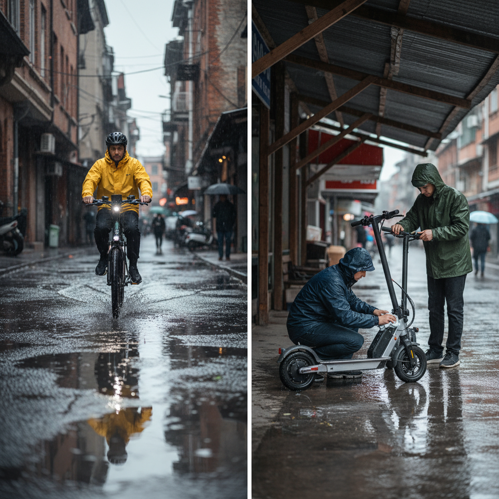 โดยทั่วไป E-Bike ที่มีมาตรฐานการป้องกันน้ำในระดับ IPX4 ขึ้นไป สามารถขับขี่ท่ามกลางฝนตกปรอยๆ ในระยะทางสั้นๆ ได้ แต่ควรหลีกเลี่ยงการขับขี่ในขณะที่ฝนตกหนักหรือในบริเวณที่มีน้ำท่วมขังโดยเด็ดขาด เพราะมีความเสี่ยงสูงที่น้ำจะเข้าสู่ระบบไฟฟ้าและสร้างความเสียหายรุนแรง หากไม่จำเป็น ควรเลื่อนการเดินทางออกไปก่อนเพื่อความปลอดภัยของทั้งผู้ขับขี่และตัวจักรยาน