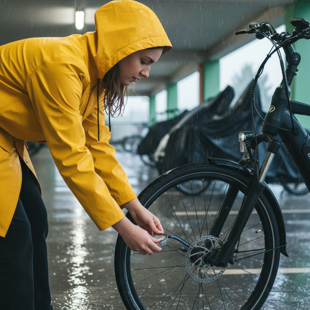 การตรวจสอบซีล, ขั้วต่อ, และสายไฟ: ก่อนขี่ในหน้าฝน ควรตรวจสอบซีลยางบริเวณช่องเสียบชาร์จ, ข้อต่อสายไฟต่างๆ และรอบๆ ตัวแบตเตอรี่ว่ายังอยู่ในสภาพดี ไม่มีร่องรอยการฉีกขาดหรือแข็งกระด้าง ขั้วต่อไฟฟ้าควรแน่นหนาและสะอาด หากเป็นไปได้ ควรใช้สเปรย์หล่อลื่นสำหรับอุปกรณ์อิเล็กทรอนิกส์ฉีดที่ขั้วต่อเพื่อไล่ความชื้นและป้องกันการกัดกร่อน