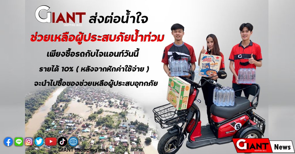 น้ำท่วม กำลังเป็นปัญหาใหญ่ขนาดนี้ ที่พี่น้องชาวไทยกำลังประสบปัญหาอยู่ วันนี้ทางร้านไจแอนท์ ช็อปปิ้ง มอล์ล จึงมาเชิญชวนทุกท่านร่วมทำบุญด้วยกัน เพียงซื้อรถไฟฟ้ากับทางเรา รายได้ 10% หลังจากหักค่าใช้จ่าย จะถูกนำไปช่วยเหลือผู้ประสบภัยในแต่ละพื้นที่ ของจังหวัดต่างๆ ค่ะ