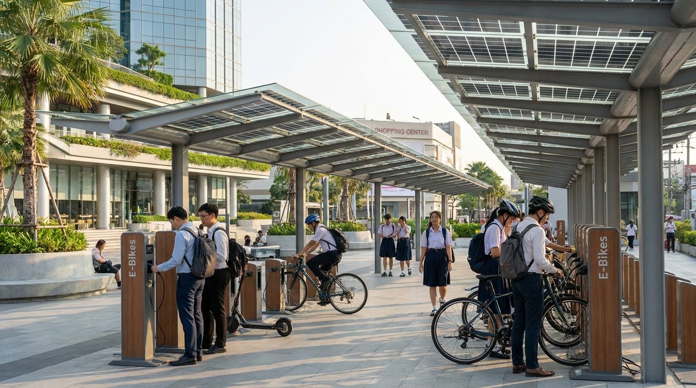 - นวัตกรรมพลังงานสะอาด: การพัฒนาจุดชาร์จที่ใช้พลังงานแสงอาทิตย์ (Solar EV Charging) สำหรับ E-Bike และสกู๊ตเตอร์ไฟฟ้า จะกลายเป็นมาตรฐานใหม่ตามจุดเชื่อมต่อขนส่งสาธารณะและอาคารสำนักงาน