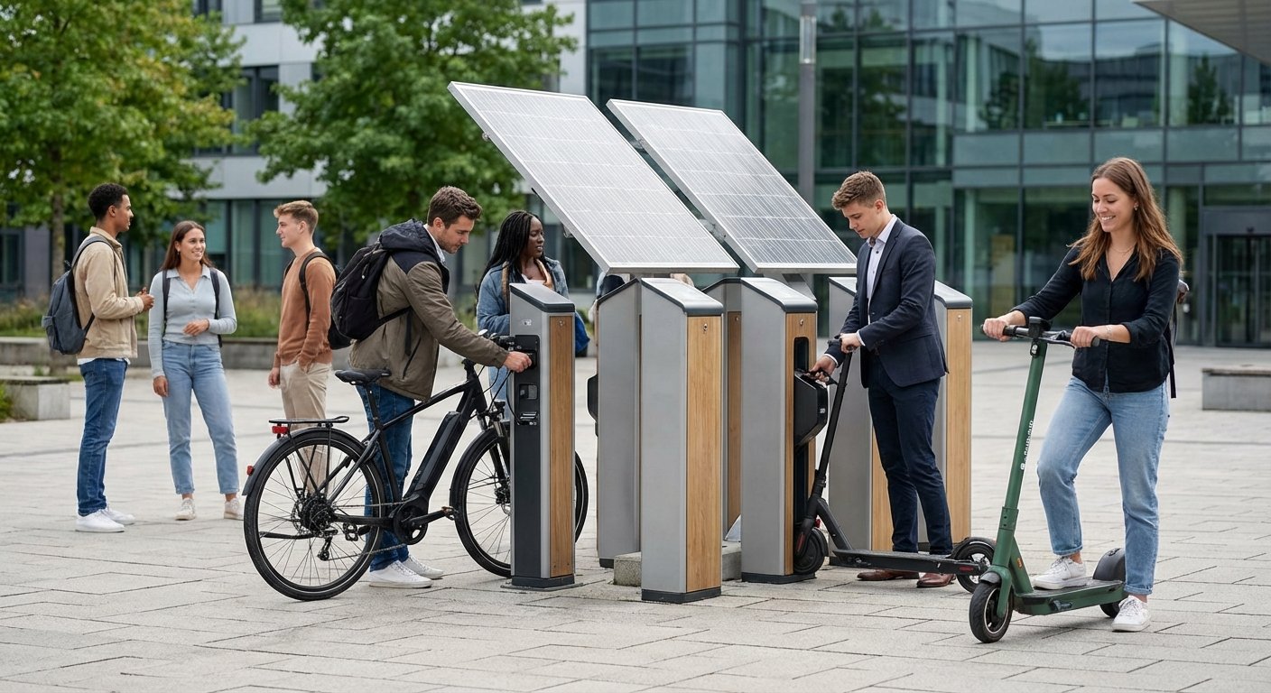 - ที่จอดรถอัจฉริยะ: อาคารสำนักงาน มหาวิทยาลัย หรือห้างสรรพสินค้า อาจมีการติดตั้งจุดจอด E-Bike ที่มีหลังคาโซลาร์เซลล์ ให้ผู้ใช้สามารถจอดและชาร์จไฟได้ฟรี