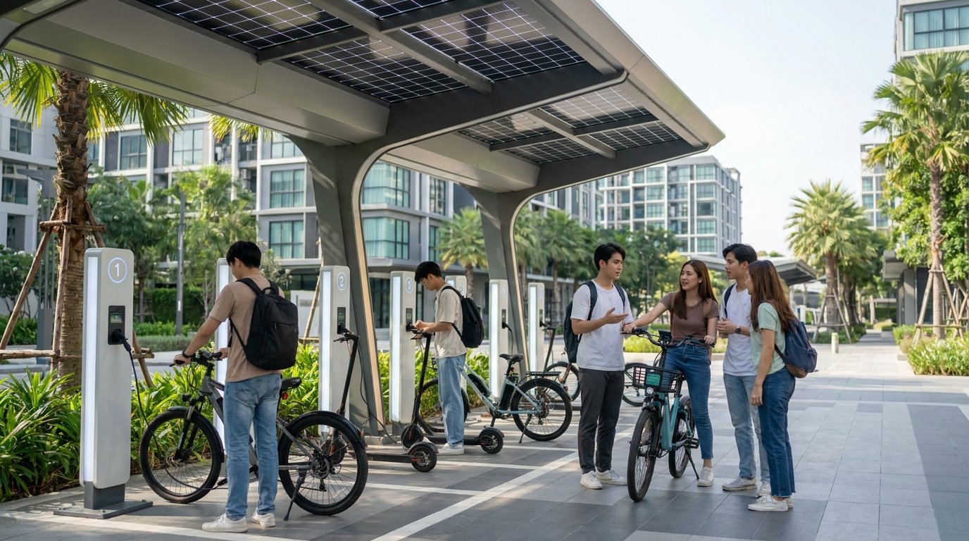 ประการสุดท้ายคือ การพัฒนาโครงสร้างพื้นฐาน ที่รองรับการใช้งาน EV มากขึ้น ดังจะเห็นได้จากโครงการนำร่องในหลายมหาวิทยาลัยและคอนโดมิเนียมในประเทศไทย ที่เริ่มมีการติดตั้งจุดชาร์จพลังงานแสงอาทิตย์สำหรับจักรยานไฟฟ้าและสกู๊ตเตอร์ไฟฟ้าโดยเฉพาะ การขยายตัวของสถานีชาร์จเหล่านี้จะช่วยสร้างความเชื่อมั่นและกระตุ้นให้ผู้คนหันมาใช้ยานยนต์ไฟฟ้ากันอย่างแพร่หลายมากขึ้นในปี 2026 และปีต่อๆ ไป