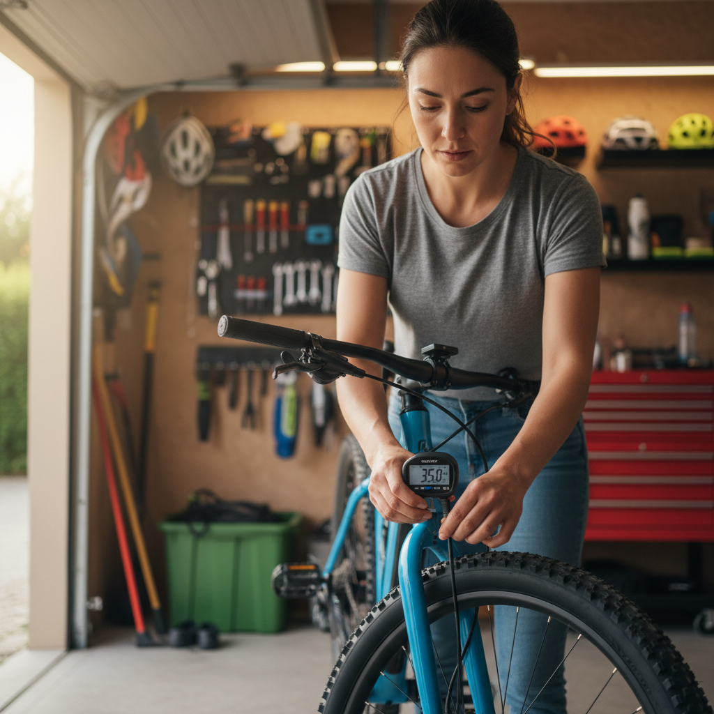 - การเช็กแรงดันลมยาง: ใช้ที่สูบลมที่มีเกจวัดแรงดัน (PSI) เพื่อตรวจสอบลมยาง ค่าแรงดันที่เหมาะสมจะระบุไว้บนแก้มยาง โดยทั่วไปจะอยู่ระหว่าง 30-50 PSI สำหรับยาง E-Bike ทั่วไป การเติมลมยางให้เหมาะสมจะช่วยลดแรงต้านในการขับขี่, เพิ่มประสิทธิภาพของแบตเตอรี่, และป้องกันปัญหายางแบนหรือขอบล้อเสียหาย
